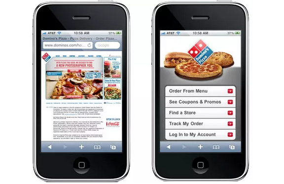 桌面端網(wǎng)頁(yè)在移動(dòng)端設(shè)備上首要的障礙就是導(dǎo)航的使用??纯聪旅鍰omino批薩的案例,它的桌面端和移動(dòng)端網(wǎng)頁(yè)的對(duì)比就相當(dāng)明顯,移動(dòng)端頁(yè)面經(jīng)過(guò)優(yōu)化之后的體驗(yàn)就完全不同。簡(jiǎn)單說(shuō)來(lái),優(yōu)化后的移動(dòng)端頁(yè)面更加干凈,有著更容易導(dǎo)航的CTA按鈕。