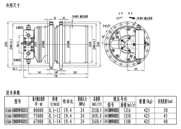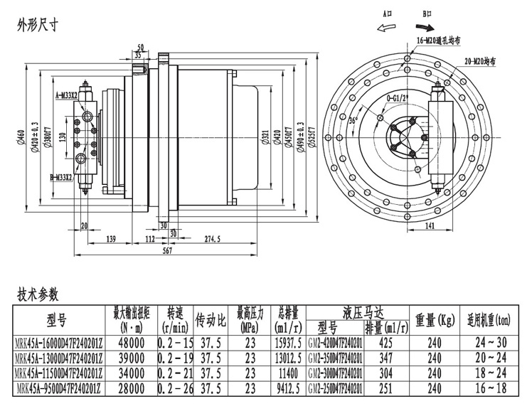 MRK45系列以上的行走減速機(jī)輸出扭矩在40000扭米以上,最大到十萬扭米,可采用柱塞馬達(dá)或者斜軸馬達(dá)驅(qū)動(dòng)。一般用在大型履帶底盤或者輪式行走用。