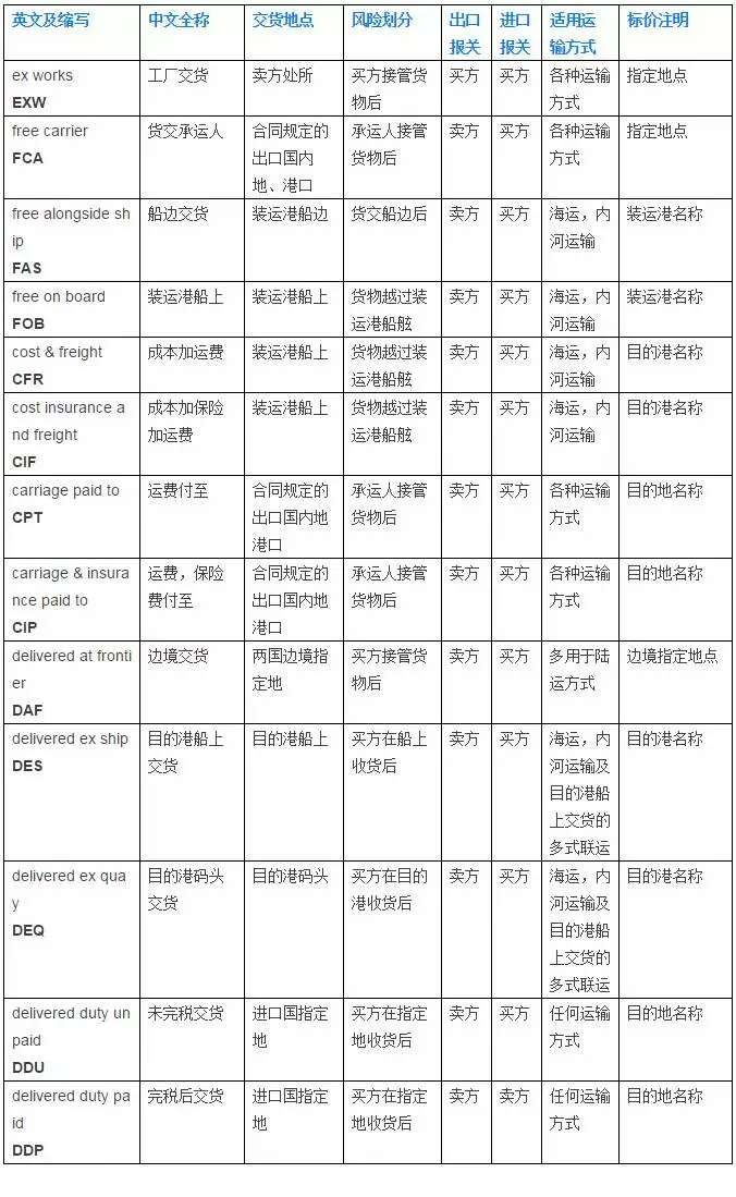 《2000年國際貿(mào)易術(shù)語解釋通則》(Incoterms 2000)列出十三種,比較如下:
