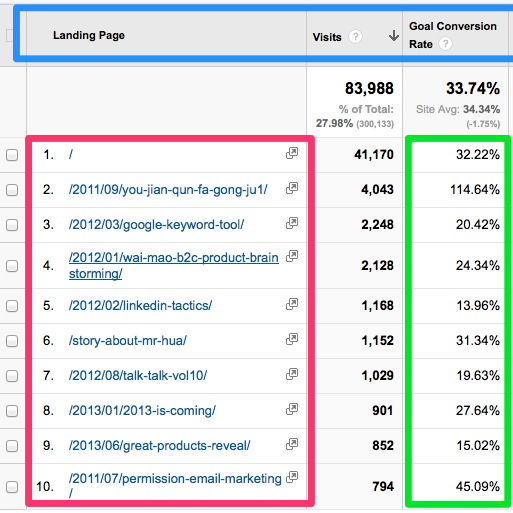 還有一種情況,我們可以通過Google Analytics里的比較功能,來把兩個維度結(jié)合起來比較,比如說我們把直接流量的登陸頁地址和實際詢盤獲取的比例結(jié)合起來分析,如下圖,藍色代表了三種維度,依次是:直接流量登陸頁,訪問次數(shù),轉(zhuǎn)換比例。 紅色框子內(nèi)就是具體的直接流量登陸頁的地址URL, 綠色則是具體的轉(zhuǎn)換率數(shù)字。從這些數(shù)字你可以看到哪個頁面轉(zhuǎn)換率最高,哪些頁面轉(zhuǎn)換率低,對于轉(zhuǎn)換率高的頁面我們可以盡量增加他的曝光度或者增加推廣力度,而對于轉(zhuǎn)換率低的則很明顯我們需要去做網(wǎng)站的用戶體驗調(diào)整了。