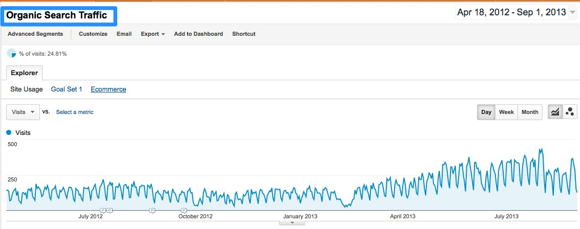 搜索流量(Search Traffic) 是指通過搜索引擎獲取的流量,這包括了付費和免費的流量,掌握搜索流量的數(shù)據(jù)也是至關(guān)重要的,這些數(shù)據(jù)可以幫助你知道你所做的SEO效果如何,哪些地方可以加強,哪些地方是無用功,首先在Google Analytics工具中,我們可以看到我們網(wǎng)站的搜索流量在過去特定時間內(nèi)的變化 (下圖為米課從2012年4月到2013年8月的搜索流量變化)通過這個數(shù)據(jù)你可以大概知道你的網(wǎng)站的健康情況,當(dāng)然這還只是一個Overview大體的數(shù)據(jù),不過從中你也可以發(fā)現(xiàn)很多細節(jié)。比如某個時間段流量降低了,我們就可以就這個特定的時間段做更深的分析。