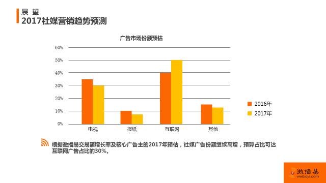 ◣ 預(yù)估2017年社媒廣告將繼續(xù)高增,預(yù)算占比可達(dá)互聯(lián)網(wǎng)廣告占比的30%;