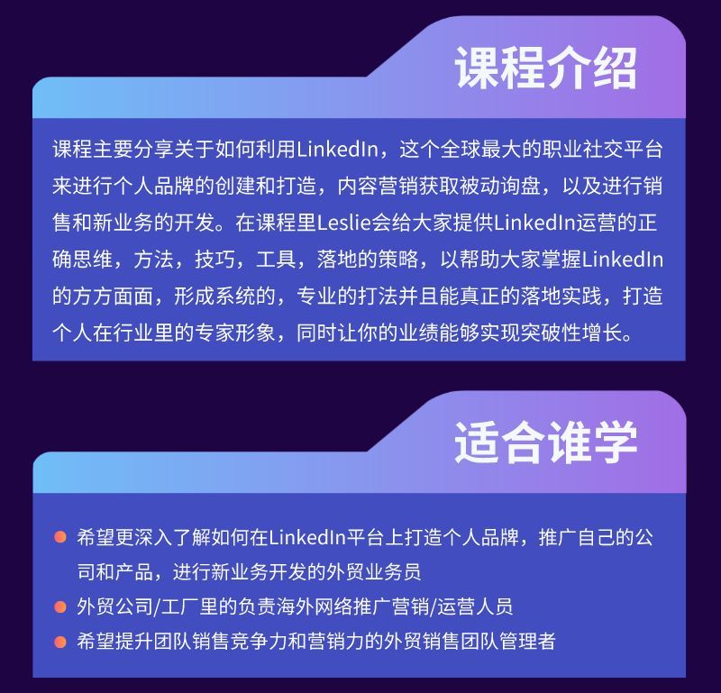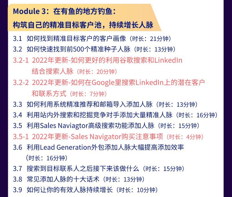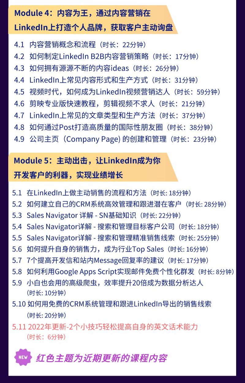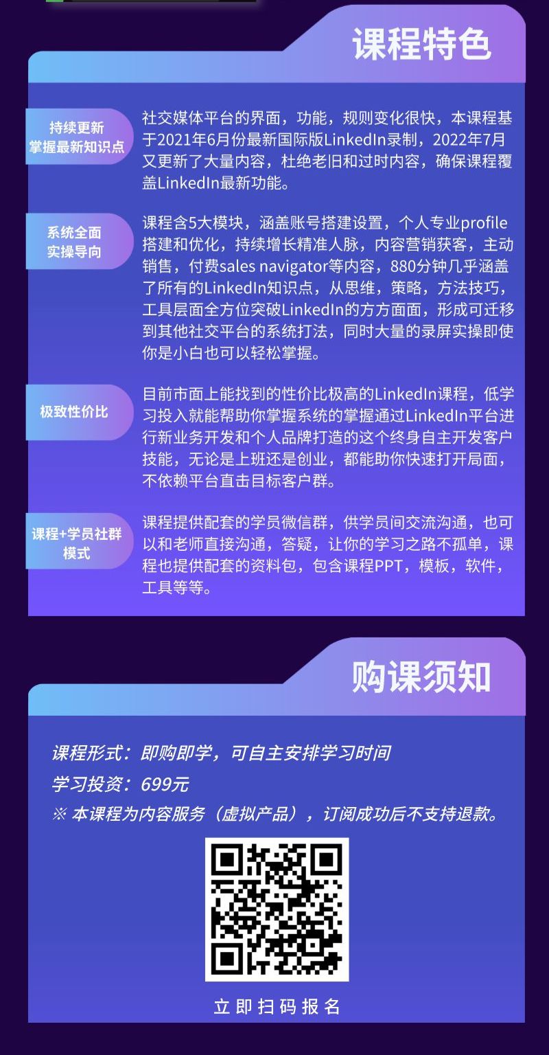 LinkedIn在過去一年發(fā)生了一些大的變化,我們的領(lǐng)英課程也在不斷結(jié)合現(xiàn)況進(jìn)行更新,只為給大家更新、更全面、更系統(tǒng)的干貨內(nèi)容,絕不玩套路!大量實(shí)操指導(dǎo)視頻,小白也能學(xué)得會(huì)~